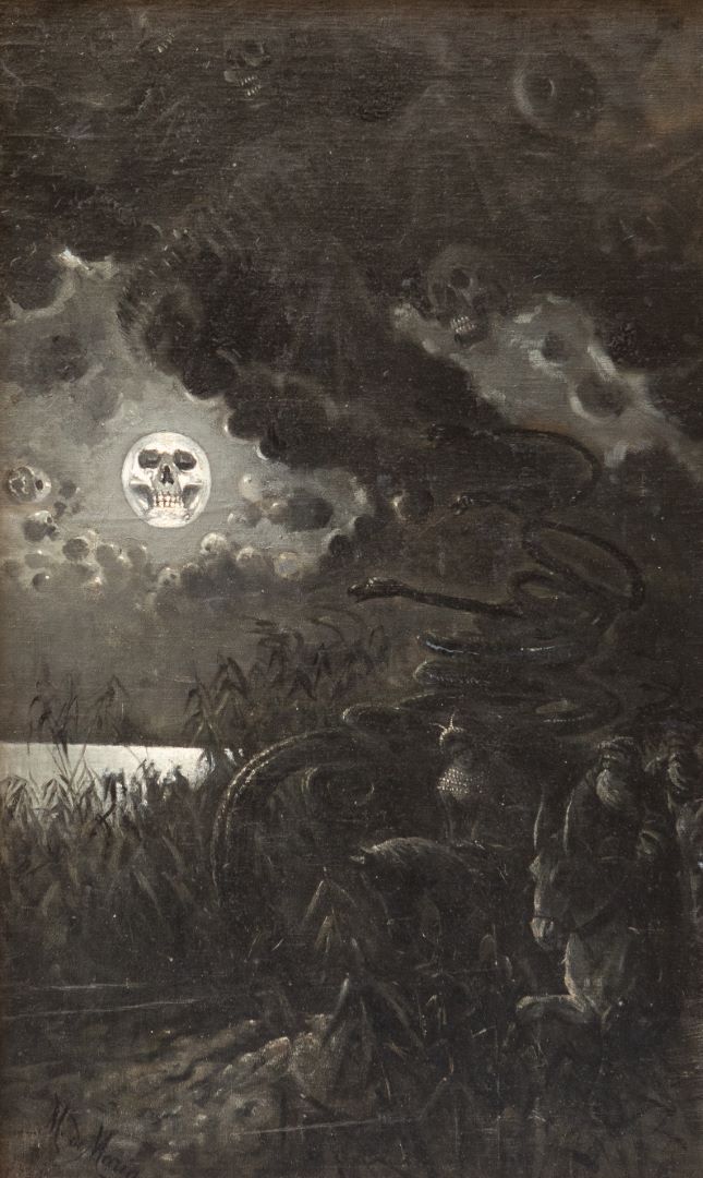Sono presenti suggestioni letterarie e simboliste come il riferimento all’opera di Gabriele D’annunzio (1863-1938) Isaotta Guttadauro (1886), e in particolar modo alla frase poetica “Sale dubbio vapor su dagli stagni che in alto all’aria forme truci assume”. Molto rilevante è anche il riferimento a Mario de Maria (1852- 1924) pittore e architetto bolognese, anch’egli ispirato dalla poetica decadentista di D’annunzio, in particolare al celebre dipinto simbolista L’alunna.