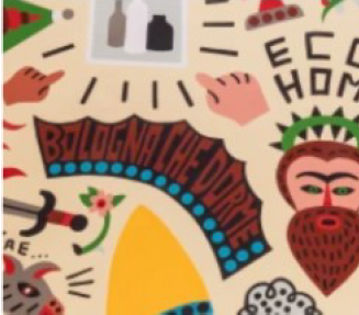 La cultura bolognese viene raffigurata da Corvino con un emblema dello “spirito petroniano” (1) attraverso la scritta “Bologna che dorme”, riferimento al periodico umoristico e letterario pubblicato tra il 1898 e il 1899, e noto per le copertine a colori e i disegni di Augusto Majani (1867-1959), conosciuto come Nasìca. Questo giornale proponeva racconti, notizie bolognesi, poesie e bozzetti molto spesso ironizzando sui personaggi locali e la vita salottiera.