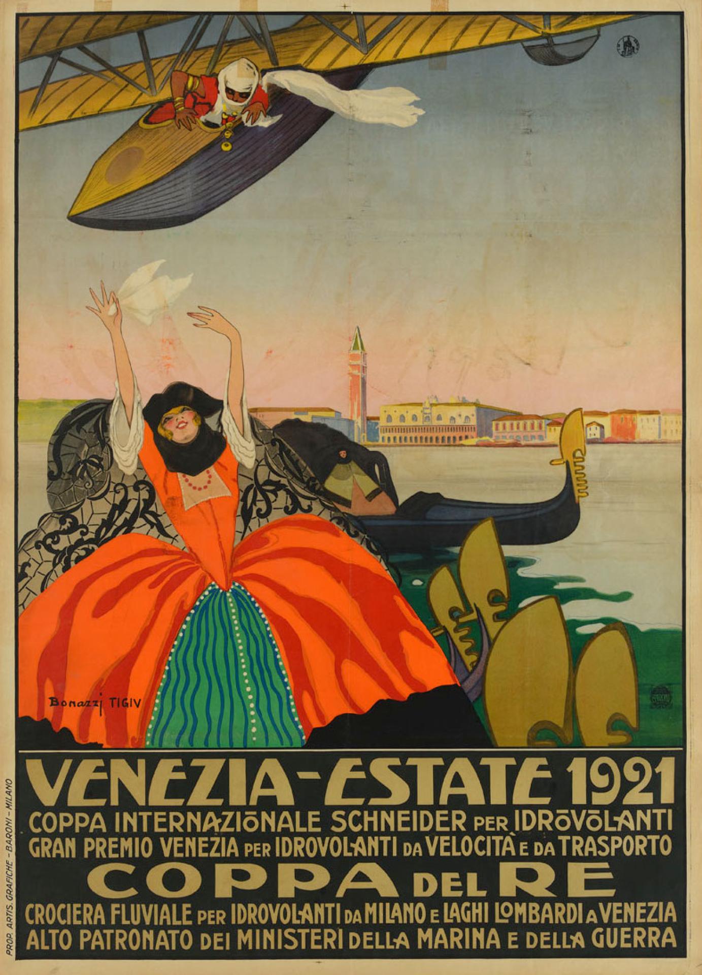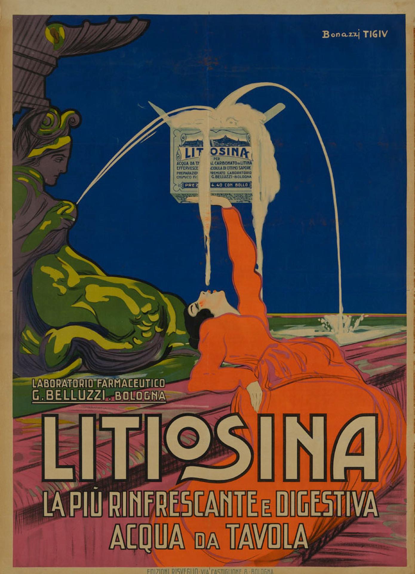 Le prime produzioni grafiche negli anni ‘20 del Novecento denotano una progressiva evoluzione delle conoscenze e delle influenze dei movimenti artistici del tempo. Una selezione di tre manifesti pubblicitari ci può guidare alla scoperta delle capacità da illustratrice dell’artista, l’analisi di tre opere emblematiche ci può permettere di costruire una panoramica dello sviluppo stilistico e contenutistico nei progetti grafici dell’artista. Uno dei primi manifesti realizzati in grande formato è del 1917 “Acqua Litiosina” (imm. 3), un compito che permette alla Bonazzi di evolvere e maturare il linguaggio grafico, complici le influenze del gruppo di artisti di calibro internazionale che ruotava intorno alla tipografia bolognese Edmondo Chappuis. Un ulteriore cambiamento all’approccio grafico della Bonazzi si può notare nella commissione di un manifesto per gare di idrovolanti; “Coppa del Re” (1921), (imm. 4), secondo manifesto dell’artista che presenta diversi elementi riconducibili all’Art Nouveau (influenze che avrà modo di abbandonare nella produzione per il calendario Barilla, il quale segnerà una svolta in direzione del linguaggio Art Déco). Un terzo manifesto degno di nota è quello realizzato su richiesta dell’azienda di liquori veneziana “F.lli Pilla” (1937), (imm. 5), evidenziando un nuovo linguaggio che si distanzia dai precedenti approcci che avevano caratterizzato “Coppa del Re” e “Calendario Barilla”.